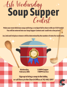 Come early for our annual Soup Supper Contest (5:30-6:45 PM). Try some tasty soups and vote for your favorite!