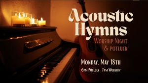 The evening begins on Monday, May 18th, starting with a potluck dinner at 6:00 PM. We invite you to bring a favorite dish to share as we enjoy a meal together before moving into the worship center at 7:00 PM for a sweet time of worship to our King!