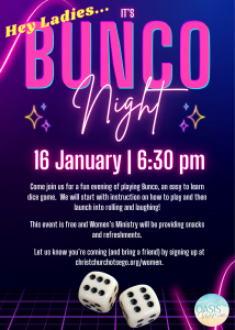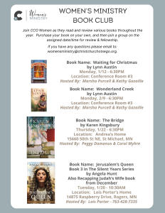 Women’s Ministry hosts book clubs monthly covering a variety of Christian authors. If you are interested in finding out more, email womensministry@christchurchotsego.org
